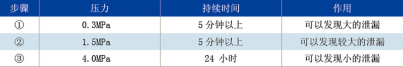 3.氣密性試驗(yàn)銅管焊接完成后必須對(duì)銅管進(jìn)行壓力試驗(yàn),保證銅管系統(tǒng)無泄漏,具體操作如下:a.將干燥的氮?dú)獬淙脬~管和室內(nèi)機(jī)系統(tǒng),禁止接室外機(jī)進(jìn)行壓力試驗(yàn);b.分三個(gè)階段加壓至試驗(yàn)壓力,R410A冷媒系統(tǒng)試驗(yàn)壓力為4.0MPa,R22冷媒系統(tǒng)試驗(yàn)壓力為2.8MPa;c.在試驗(yàn)壓力穩(wěn)定后記錄下此時(shí)的壓力表讀數(shù)及環(huán)境溫度值,保壓24小時(shí),在排除環(huán)境溫度對(duì)壓力的影響后(溫度升高或降低1℃,壓力升高或下降0.01MPa),對(duì)比前后壓力表讀數(shù),壓差不大于0.02MPa的說明保壓合格;d.若保壓不合格,必須查到漏點(diǎn)并解決,然后再重新進(jìn)行氣密性試驗(yàn),直至合格。e.保壓合格后,應(yīng)將壓力降低至1.0MPa左右,避免銅管系統(tǒng)長(zhǎng)時(shí)間為高壓狀態(tài)。